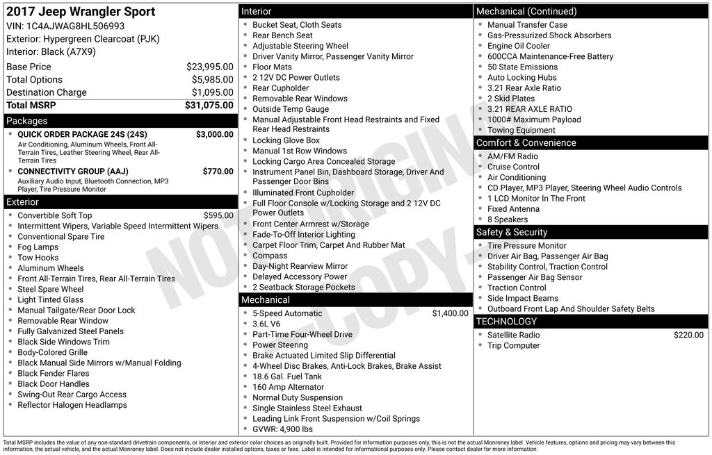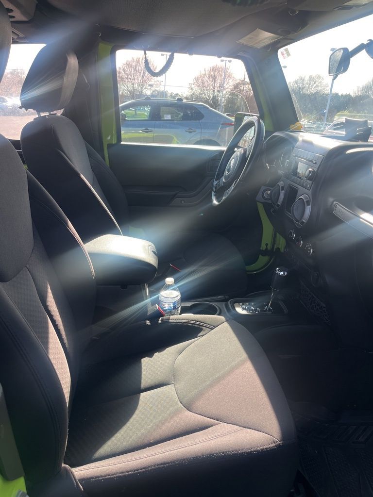 1-Yr SiriusXM Radio Service, 16" x 7.0" Luxury Styled Steel Wheels, 17" x 7.5" Aluminum Wheels, 3.21 Rear Axle Ratio, 4-Wheel Disc Brakes, 8 Speakers, ABS brakes, Air Conditioning, AM/FM radio, Audio Jack Input for Mobile Devices, Brake assist, CD player, Chrome/Leather Wrapped Shift Knob, Cloth Seats w/Adjustable Head Restraints, Compass, Connectivity Group, Driver door bin, Driver vanity mirror, Dual front impact airbags, Electronic Stability Control, Front anti-roll bar, Front Bucket Seats, Front Center Armrest w/Storage, Front fog lights, Integrated roll-over protection, Leather Wrapped Steering Wheel, Low tire pressure warning, Normal Duty Suspension, Occupant sensing airbag, Outside temperature display, Passenger door bin, Passenger vanity mirror, Power steering, Premium Black Sunrider Soft Top, Quick Order Package 24S, Radio: 130, Rear anti-roll bar, Remote USB Port, SIRIUS Satellite Radio, Speed control, Steering wheel mounted audio controls, Tachometer, Tilt steering wheel, Tire Pressure Monitoring Display, Traction control, Trip computer, Uconnect Voice Command w/Bluetooth, Variably intermittent wipers, Vehicle Information Center.