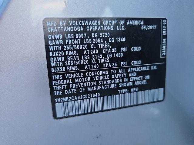 **REAR BACK UP CAMERA**, **BLUETOOTH**, **LEATHER SEATS**, 12 Speakers, 3.60 Axle Ratio, 3rd row seats: split-bench, 4-Wheel Disc Brakes, ABS brakes, Air Conditioning, Alloy wheels, AM/FM radio: SiriusXM, Auto High-beam Headlights, Auto-dimming Rear-View mirror, Automatic temperature control, Brake assist, Bumpers: body-color, Compass, Delay-off headlights, Driver door bin, Driver vanity mirror, Dual front impact airbags, Dual front side impact airbags, Electronic Stability Control, Emergency communication system: VW Car-Net, Four wheel independent suspension, Front anti-roll bar, Front Bucket Seats, Front Center Armrest, Front dual zone A/C, Front fog lights, Front reading lights, Garage door transmitter: HomeLink, Heated door mirrors, Heated front seats, Heated rear seats, Heated steering wheel, Heated/Ventilated Front Bucket Seats, Heavy Duty Trunk Liner w/VW CarGo Blocks, Illuminated entry, Low tire pressure warning, Memory seat, Navigation System, Occupant sensing airbag, Outside temperature display, Overhead airbag, Overhead console, Panic alarm, Passenger door bin, Passenger vanity mirror, Perforated Vienna Leather Seating Surfaces, Power door mirrors, Power driver seat, Power Liftgate, Power moonroof, Power passenger seat, Power steering, Power windows, Radio data system, Radio: Discover Media 8.0" Touchscreen w/CD/Nav, Rain sensing wipers, Rear air conditioning, Rear anti-roll bar, Rear audio controls, Rear reading lights, Rear seat center armrest, Rear window defroster, Rear window wiper, Remote CD player, Remote keyless entry, Roadside Assistance Kit, Roof rack: rails only, Rubber Mats Kit - Bench Seats, Security system, Speed control, Speed-sensing steering, Split folding rear seat, Spoiler, Standard Suspension, Steering wheel mounted audio controls, Tachometer, Telescoping steering wheel, Tilt steering wheel, Traction control, Trip computer, Turn signal indicator mirrors, Variably intermittent wipers, Ventilated front seats, Wheels: 20" Mejorada Alloy.