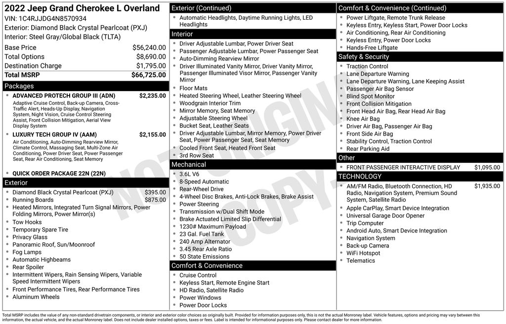 Diamond Black Crystal Pearlcoat 2022 Jeep Grand Cherokee L Overland 4D Sport Utility RWD 3.6L V6 24V VVT 8-Speed Automatic